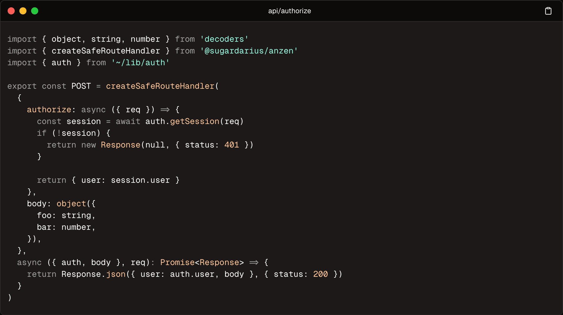 Create clean, type-safe route handlers, pages, and layouts using factory-functions with authorization hooks, and built-in error handling. Comes with standard schema validation, supports segments, search params, body, and form data validation