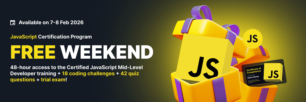 On Feb 7-8, Certificates.dev will allow free access to its JavaScript Certification Training. This means 48 hours of free, unlimited access to structured training experience, including 17 theory lessons, 18 coding challenges, and 42 pop quiz questions. You also get access to a trial exam to test your readiness and experience the assessment platform, complete with multiple-choice questions and a coding challenge.
